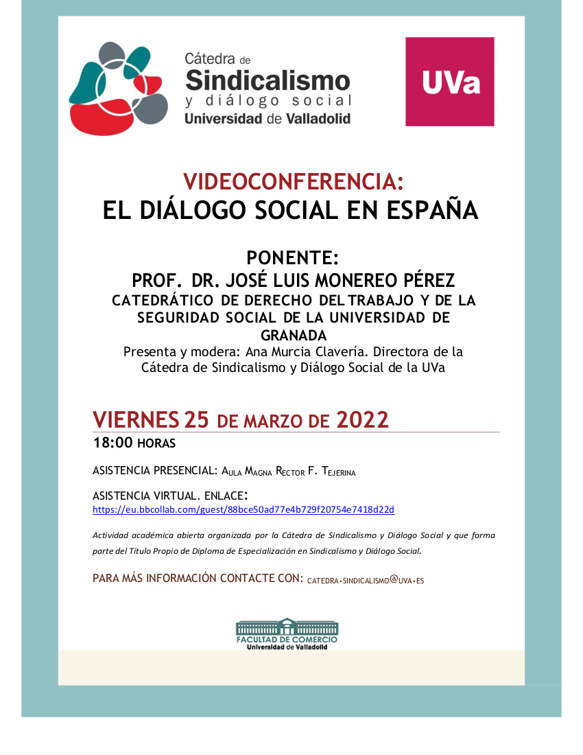 VIDEOCONFERENCIA: «EL DIÁLOGO SOCIAL EN ESPAÑA» (viernes 25 de marzo de 2022, 18:00h). | Facultad de Comercio